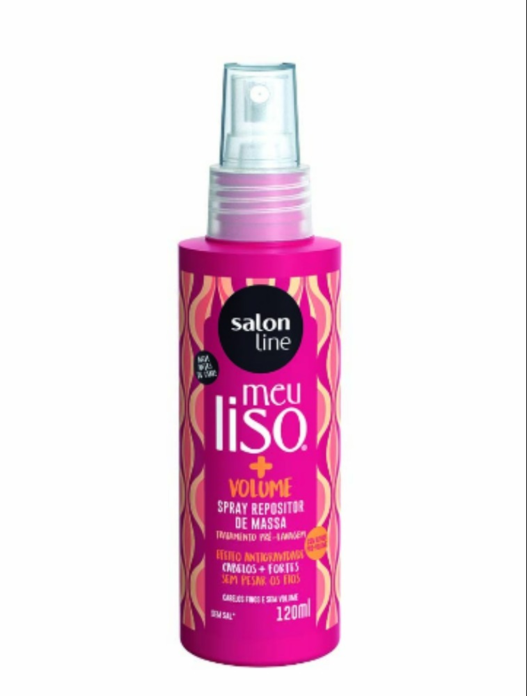 A linha Meu liso + Volume foi desenvolvida especialmente para cuidar dos cabelos ondulados e lisos, tanto cabelos naturais quanto alisados quimicamente. É perfeita para você que tem cabelo fino e gostaria de um super volume sem frizz. O spray Repositor de massa é um tratamento capilar pré-lavagem que cuida dos fios, deixando-os mais resistentes e saudáveis e sem quebra. Seu resultado é um cabelo mais encorpado e com vida. Como usar o Spray Repositor de Massa Salon Line Meu Liso + Volume? Com o cabelo seco e antes de ser lavado, aplique o Spray Repositor de Massa + Volume do comprimento até as pontas. Deixe agir por, no mínimo, 15 minutos e fique livre para fazer outras atividades enquanto aguarda o tempo de pausa. Enxágue bem e lave normalmente. Pode ser usado diariamente. Dicas de uso: Para potencializar o resultado, use a linha completa Meu Liso + Volume.