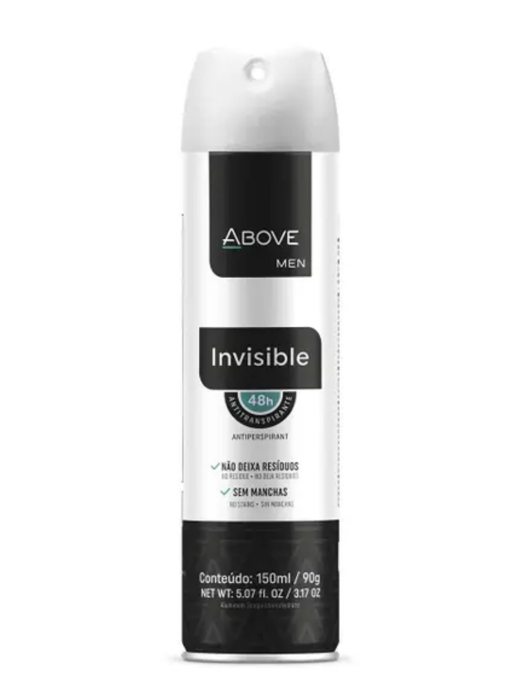 DESCRIÇÃO: Se a sua preocupação com antitranspirantes vai além das axilas e se estende às suas roupas, o antitranspirante Above Invisible vai te ajudar. Sua fórmula foi cautelosamente desenvolvida visando evitar a formação de resíduos e manchas em diversos tipos de tecidos, protegendo por 48 horas e com uma fragrância de erva doce, na versão feminina, e bambu, na versão masculina. Além disso, é livre de álcool e triclosan e dermatologicamente testado. Você pode não ter o superpoder de se tornar invisível, mas seu antitranspirante sim! MODO DE USAR: Agite bem a embalagem e aplique nas axilas a uma distância aproximada de 15 cm. Proteja os olhos durante a aplicação. PRECAUÇÕES: Cuidado, Produto Inflamável. Uso Externo. Conteúdo sob pressão. Por medida de segurança, utilize o produto conforme o modo de usar. Não pulverizar perto de fogo, não perfurar nem incinerar a embalagem mesmo quando vazia.