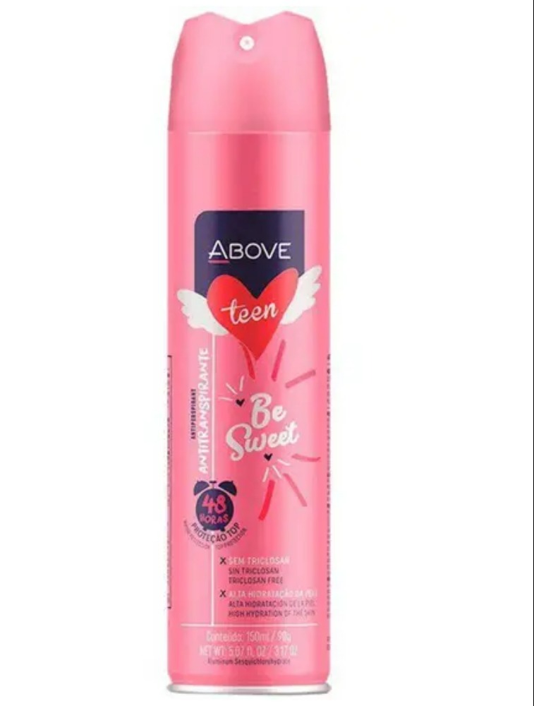 Toda menina com uma personalidade delicada sabe que ser doce é sempre um ponto a seu favor. O Antitranspirante Above Teen Be Sweet revela toda a doçura para incrementar o seu jeitinho de ser e se cuidar. Sua fragrância traz uma combinação de aromas entre jasmim, âmbar e vanilla, com um especial toque frutado. Super proteção de 48h e altra hidratação, antimanchas, jato seco, sem álcool e triclosan. A linha teen feminino é em aerossol e 100% vegano! Uma dose de otimismo nunca é demais! Embalagem de 150g, peso ultra leve de 90g, dá para levar na mochila. Aposte no eu novo desodorante com aroma suave floral frutal.