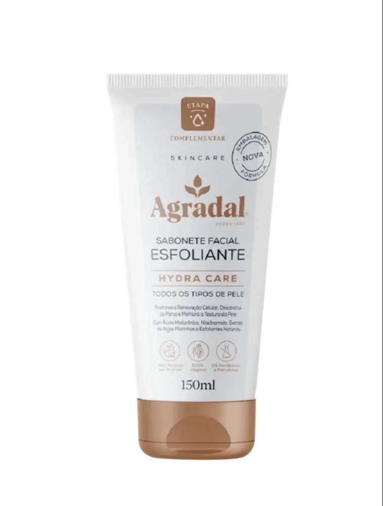 Sabonete esfoliante facial para todos os tipos de pele. Agradal Hydra Care, limpeza completa, ação hidratante e 100% vegano.