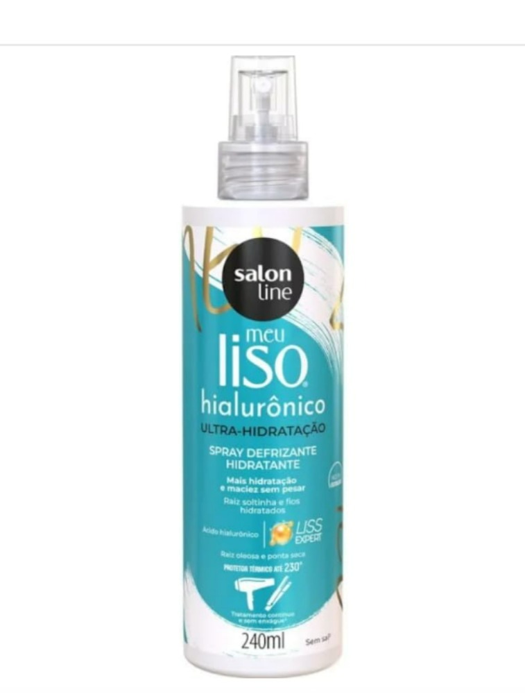 Quais os principais ativos? O Spray Defrizante Protetor Térmico Meu Liso Hialurônico conta com ácido hialurônico que garante restauração capilar, reposição de massa e controle do frizz.