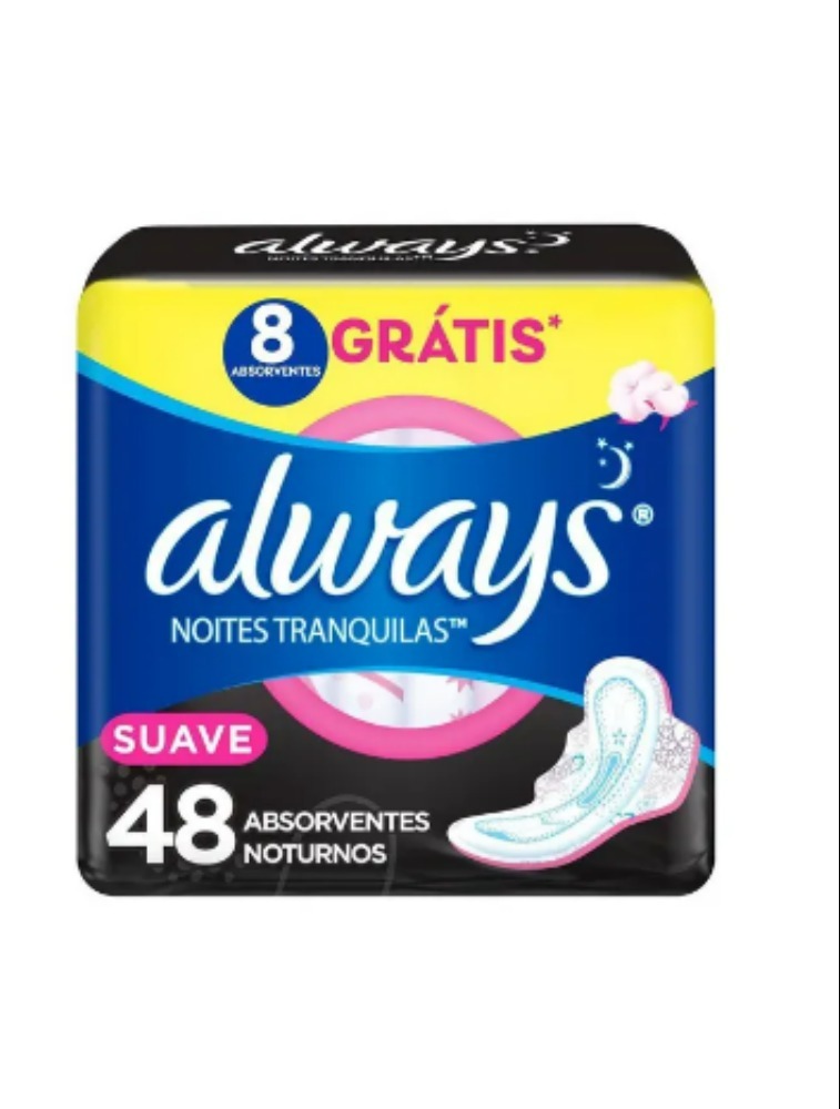 Muitas mulheres não conseguem ter uma boa noite de sono durante o período menstrual, e acordam sentindo-se cansadas ou muito cansadas. Pensando em proteção e conforto a noite toda, os novos absorventes noturnos Always Noites Tranquilas com cobertura Suave e Abas, são projetados para te ajudar a dormir confortavelmente e sem preocupações durante esse período. O novo absorvente oferece 4x mais proteção com seu formato anatômico com abas e uma estrutura fina que se adapta ao seu corpo e calcinha, independente da sua posição de dormir, além da cobertura suave como um algodão que absorve instantaneamente e protege a noite inteira com até 0% de vazamentos. Não contém fibras de algodão. Embalagem com 48 Unidades.