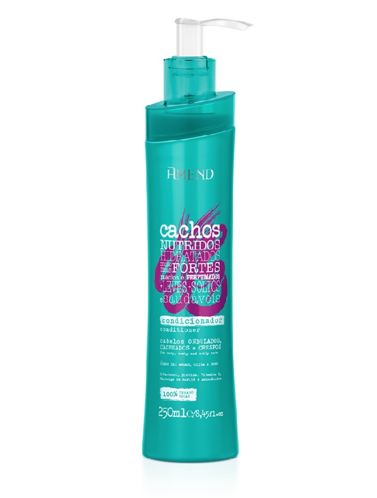Condicionador para Cabelos Cacheados Amend Cachos promove um cuidado especial com seus cachos, desenvolvemos uma linha enriquecida com os ativos: D-Panthenol e Manteiga de Karité que hidratam e suavizam; Biotina que auxilia na prevenção da queda e fortalece; Vitamina E com ações antioxidantes; um blend de Aminoácidos que reparam profundamente os cachos e um mix de óleos incríveis que protegem, nutrem, regeneram e dão movimento. Seus cachos ficarão tratados como você nunca viu!