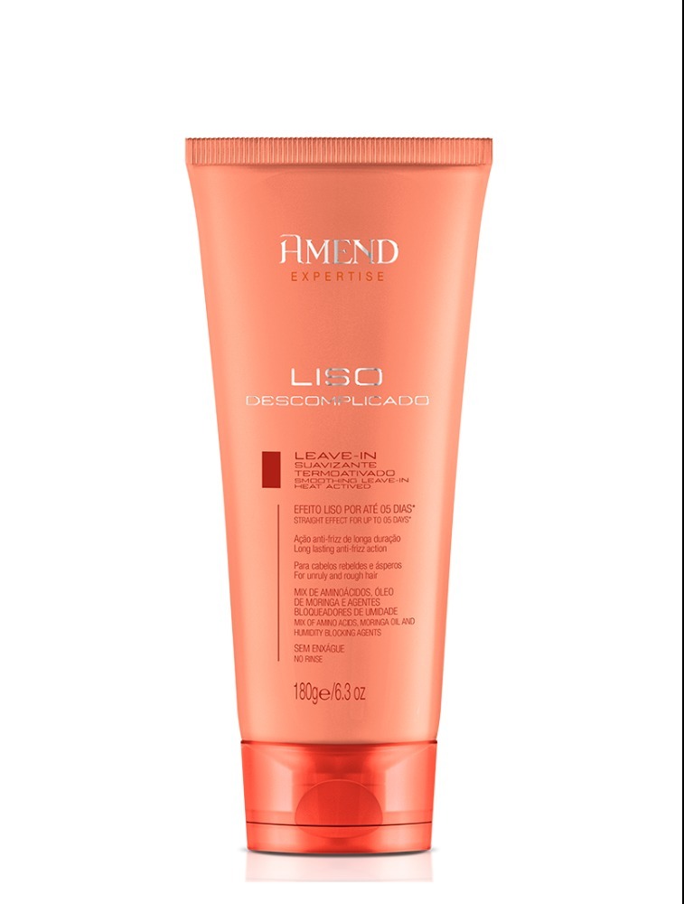 Leave-in Suavizante com Proteção Térmica Amend Expertise Liso Descomplicado: Mantém os cabelos lisos por até 05 dias* (quando usado em conjunto com demais produtos). Com proteção termoativada, potencializa com o calor do secador, minimiza os danos e facilita a escova e a chapinha. *Teste instrumental: uso do Shampoo + Condicionador + Leave-in vs shampoo clássico. Dermatologicamente testado