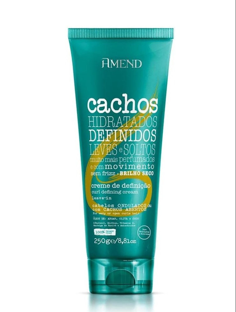 A linha Amend Cachos possui uma fórmula enriquecida com um mix de óleos e D-Pantenol, que hidrata profundamente os cachos.