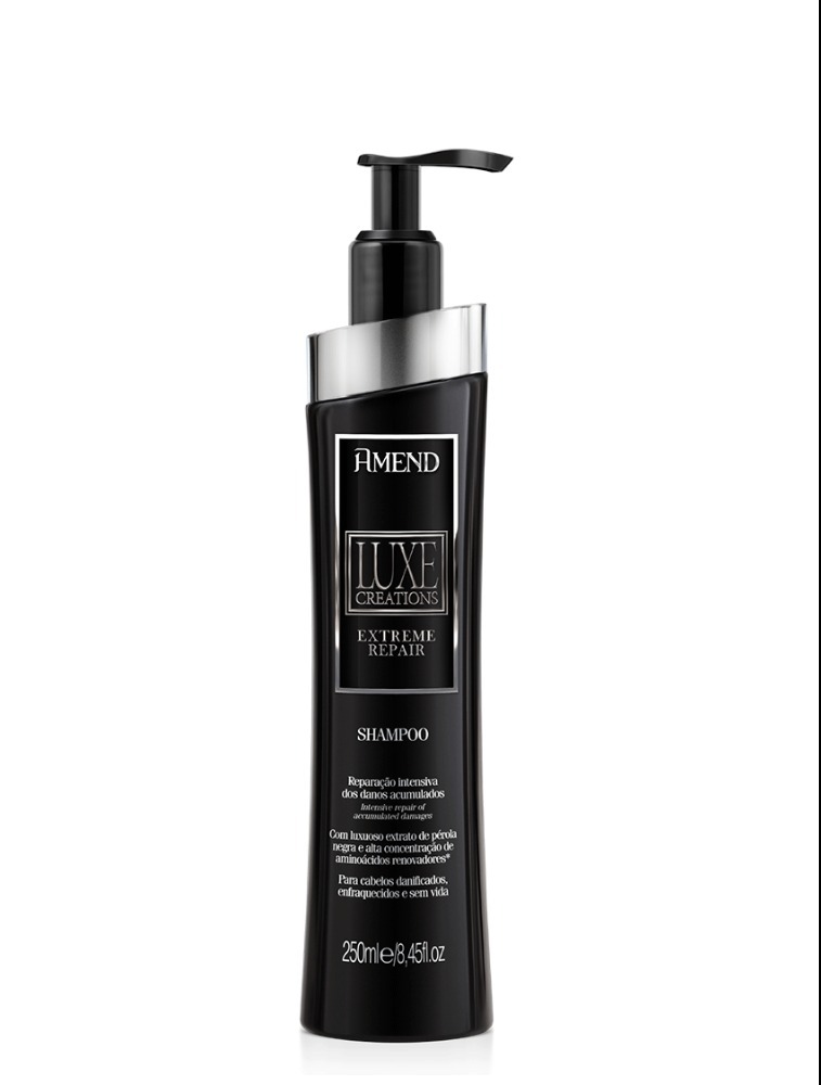 Shampoo Amend Luxe Creations Extreme Repair é elaborado com alta concentração de ativos que reparam intensamente os danos acumulados causados pelo estresse mecânico, químico, térmico e ambiental. Combatem os sinais de envelhecimento capilar (cabelos opacos, fracos e desidratados), evitam o desbotamento da cor e recuperam rapidamente os fios mantendo-os hidratados, fortes e brilhantes.