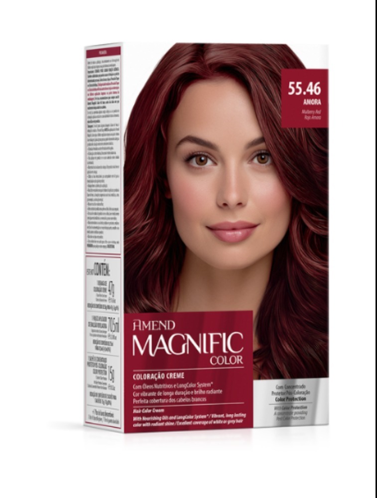 Amend Magnific Color 55.46 Amora uma coloração em creme que possibilita cores vibrantes de longa duração e brilho radiante. Sua fórmula é enriquecida com Proteína do Arroz que possui efeito restaurador e protetor, ou seja, a cor dos seus cabelos é renovada e a estrutura capilar preservada. Perfeita cobertura dos cabelos brancos. Finalize o processo de coloração com chave de ouro. Hidrate seus cabelos com concentrado protetor pós coloração color protection. Através de agentes repositores ele atua no fio em profundidade. Repõe a massa capilar protéica e aminoácidos perdidos, promovendo cabelos saudáveis e resistentes. Cabelos e cor protegidos por mais tempo!