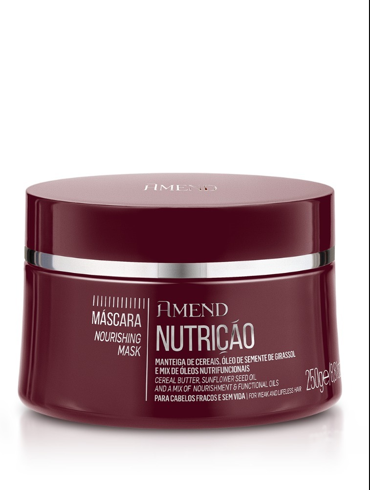 Máscara Nutrição Amend Essenciais possui alta performance para combater os principais danos dos fios. Manteiga de cereais, óleo de semente de girassol e mix de óleos nutri-funcionais. Para cabelos fracos e sem vida. A manteiga de cereais e óleos presentes na fórmula, repõem os lipídios evitando que os fios fiquem quebradiços e ásperos. Promovem a lubrificação necessária evitando a perda da água e outros componentes, mantendo a superfície do fio íntegra e homogênea. Os cabelos ficam nutridos, suaves, sem frizz, livres das pontas duplas e do ressecamento.