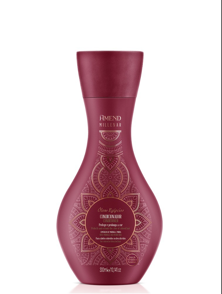 Condicionador para cabelos coloridos e descoloridos. Amend Millenar Óleos Egípcios Condicionador sela o pigmento no fio para proteger do desbotamento e garantir sua intensidade por mais tempo.