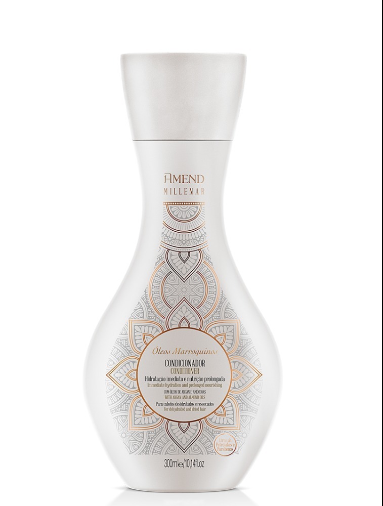 Condicionador Amend Millenar Óleos Marroquinos inspirados nos ingredientes usados há milênios no Marrocos para os cuidados da beleza, desenvolvemos um condicionador que delicadamente proporciona condicionamento intenso, efeito suavizante, maciez, elasticidade e hidratação aos fios, através da rica combinação dos óleos marroquinos e do potente ativo protetor e disciplinante extraído do Tamarindo.