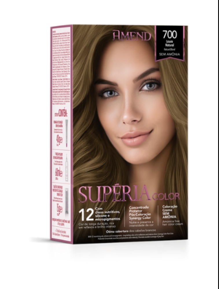 Amend Supéria Color 700 Louro Natural - Sua fórmula creme sem Amônia colore os cabelos com cores modernas, ricas em reflexos naturais e brilho intenso, sem agredir a integridade da estrutura capilar durante o processo de coloração. Contém Micropigmentos que penetram no interior do fio e Silicones que blindam a camada externa, proporcionando cor e brilho de longa duração. Promove ótima cobertura dos cabelos brancos e não resseca os fios. Pode ser aplicada em cabelos naturais, com mechas, coloridos, descoloridos, inclusive os alisados, relaxados ou com escovas progressivas. Através do Concentrado Protetor Pós Coloração Synergy Color, mantenha os cabelos com cores cheias de vida, sedosos e brilhantes, Rico em Fosfolipídios de Girassol, o Concentrado Protetor revigora, nutre profundamente e preserva a intensidade da cor retendo os pigmentos por mais tempo no interior da fibra capilar. Gostou? Veja também toda a nossa linha de Tonalizantes!