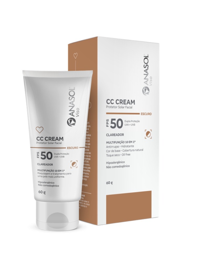 Com 10 benefícios em um único produto, Anasol CC Cream Facial FPS 50 combina maquiagem e tratamento. Sua cobertura natural com cor de base embeleza a face e melhora a uniformidade da pele disfarçando as pequenas imperfeições. Além disso, melhora a hidratação, a elasticidade e a firmeza da pele promovendo ação antirrugas. É fácil de espalhar, tem toque sequinho e ajuda a prevenir queimaduras solares causadas por raios UVB, assim como manchas e rugas causadas por raios UVA. Contém proteção UVA equivalente a 1/3 do FPS UVB. Indicado para peles muito sensíveis a queimaduras solares, aumenta a proteção da pele 50 vezes. Produto oil free, não comedogênico, sem fragrância, formulado de maneira a minimizar possível surgimento de alergia.