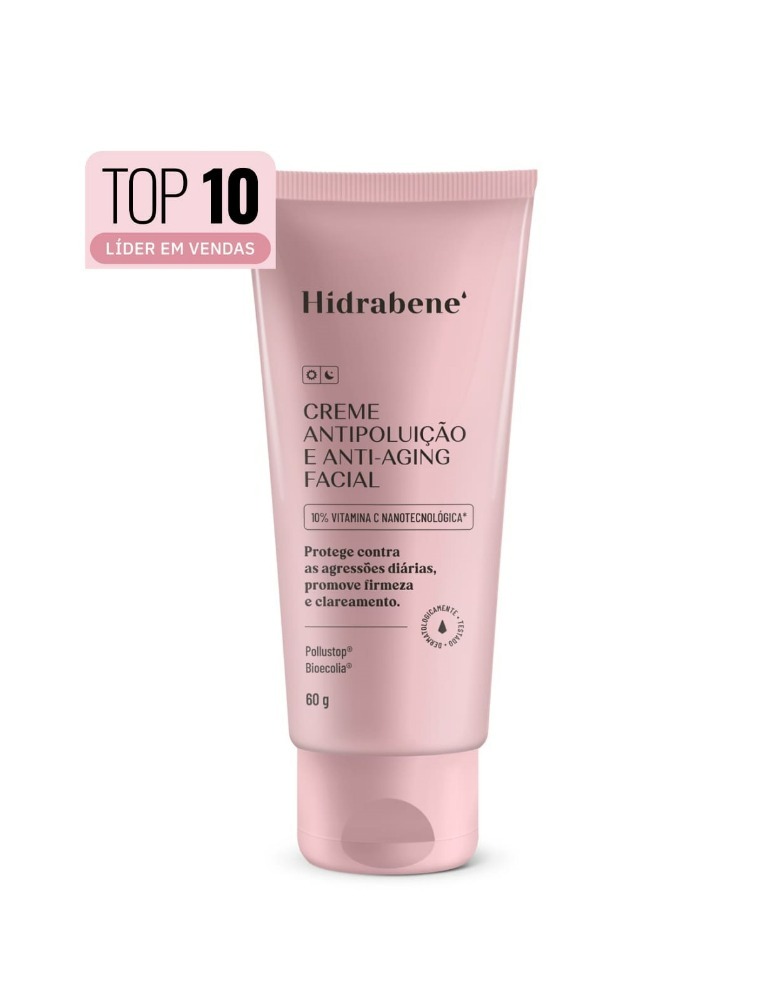 A poluição urbana e uma rotina agitada, faz a pele perder o viço e a elasticidade, gerando flacidez e envelhecimento precoce da face. O Hidrabene Creme Antipoluição e Anti-aging Facial, contém ativos que formam um escudo protetor contra a poluição urbana e estimulam a proteção natural da microbiota da pele. Junto à Vitamina C Nanotecnológica que atua sinergicamente no tratamento e prevenção do envelhecimento cutâneo promovendo firmeza, uniformidade, luminosidade e clareamento à pele. Produto dermatologicamente testado, não comedogênico, hipoalergênico, formulado de maneira a minimizar possível surgimento de alergia.