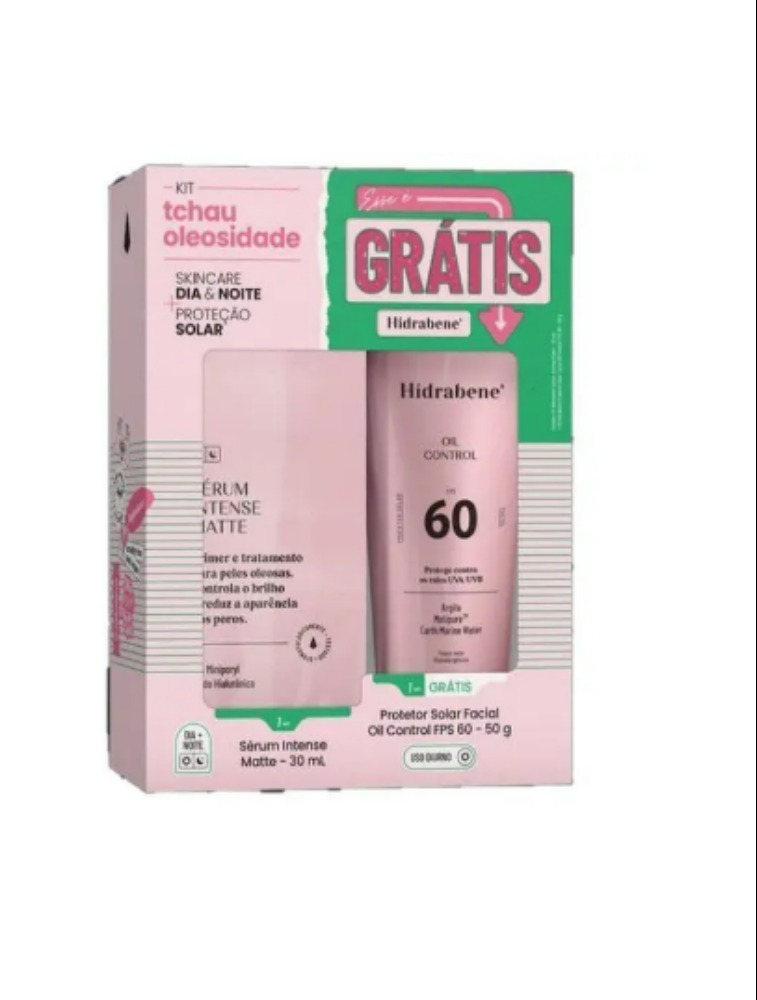 O Kit com Sérum Intense Matte Hidrabene e Protetor Oil Control FPS 60 é uma combinação perfeita para tratamento, hidratação e proteção solar para para pele mista, oleosa e acneica. O Sérum Intense Matte é um hidratante facial com uma tecnologia que matifica a pele, fecha os poros, controla a oleosidade, pode ser utilizado antes da maquiagem como primer, com ele a pele fica sequinha e aveludada durante o dia. Ele possui microesponjas que absorvem e controlam a oleosidade e Ácido Hialurônico que hidrata e minimiza linhas de expressão. Seu uso contínuo reduz os poros dilatados evitand que voltem a dilatar. O Protetor Hidrabene facial FPS 60 protege a pele da radiação UVA e UVB, controla a oleosidade, reduz poros dilatados, possui ação adstringente devido aos minerais presentes na composição inclusive o Zinco. Possui toque seco, efeito matte e é livre de óleo.