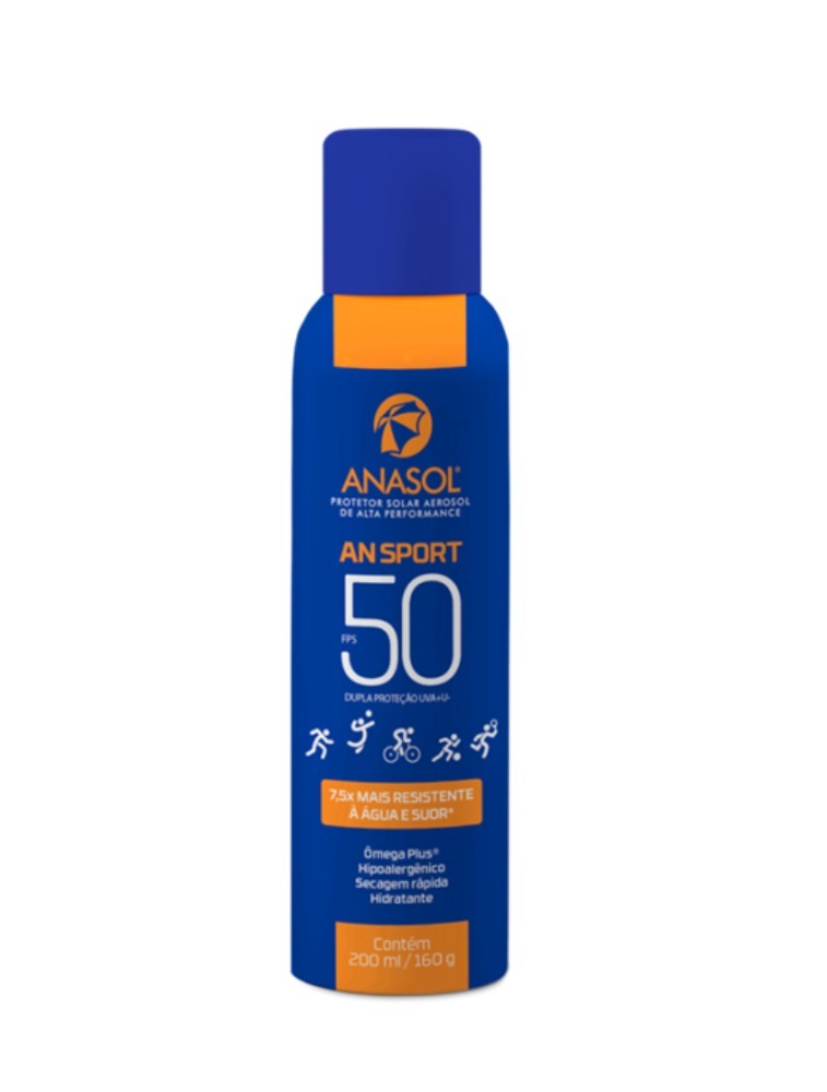 Praticar esportes é sinal de saúde. Anasol AN Sport FPS 50 foi especialmente desenvolvido para quem gosta de praticar esportes ao ar livre. Dermatologicamente testado. Totalmente transparente com textura leve que seca rapidamente ao aplicar na pele, sem deixar traços brancos. Contém vitamina E que possui ação antioxidante e Ômega Plus®, rico em ômegas 6,7 e 9 que protegem a pele mantendo sua hidratação e nutrição. Aumenta a proteção da pele 50 vezes e é indicado para pele muito sensível a queimaduras solares. Oferece alta proteção. Ajuda a prevenir queimaduras solares causadas pelos raios UVB, além de rugas e envelhecimento precoce da pele causado pelos raios UVA. Contém proteção UVA equivalente a, no mínimo, 1/3 do FPS declarado (proteção UVB). Produto hipoalergênico, formulado de maneira a minimizar possível surgimento de alergia. *5h resistência à água e suor