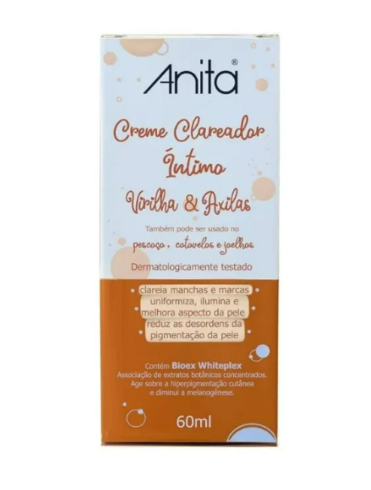 Clarei manchas e marcas, inconformista e ilumina a pele das axilas, virilha, pescoço cotovelos e joelhos. O creme clareador Anita possui fórmula especial composta por extratos botânicos concentrados que agem na hiperpigmentação da pele, diminuindo assim a melanina no local onde o produto é aplicado.
