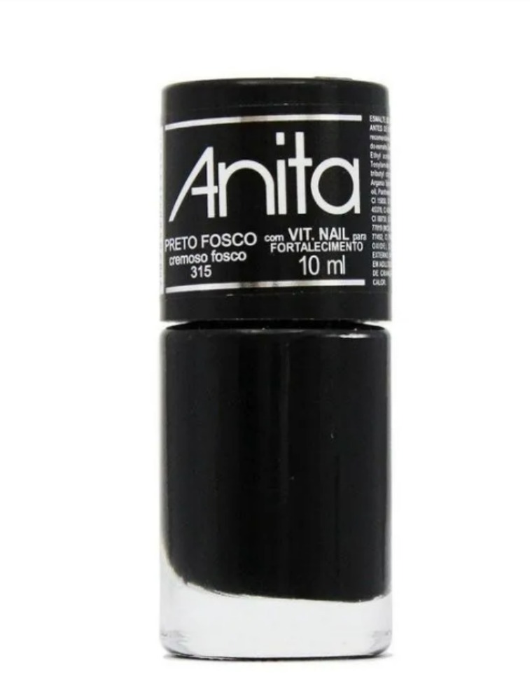 Esmalte Anita Esmalte 315 Preto Fosco 10ml Modo de Usar Agite antes de usar – aplicar sobre as unhas, recomenda-se aplicar a base de unhas antes do esmalte.