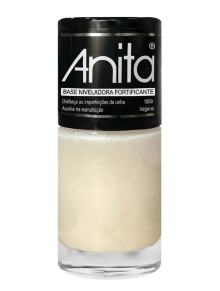 Base niveladora fortificante. Anita 1059 disfarça e nivela as imperfeições da unha, além de auxiliar na esmaltação.