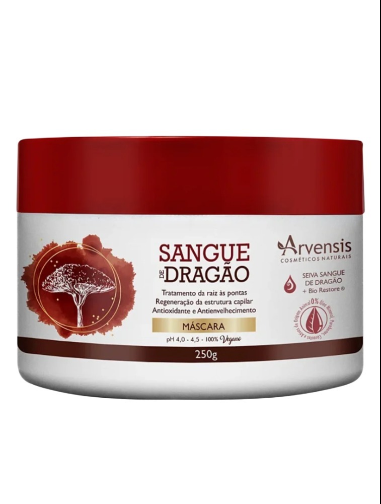 Máscara capilar para cabelos danificados. Arvensis Sangue de Dragão hidrata, fortalece a fibra capilar, combate o envelhecimento dos fios.