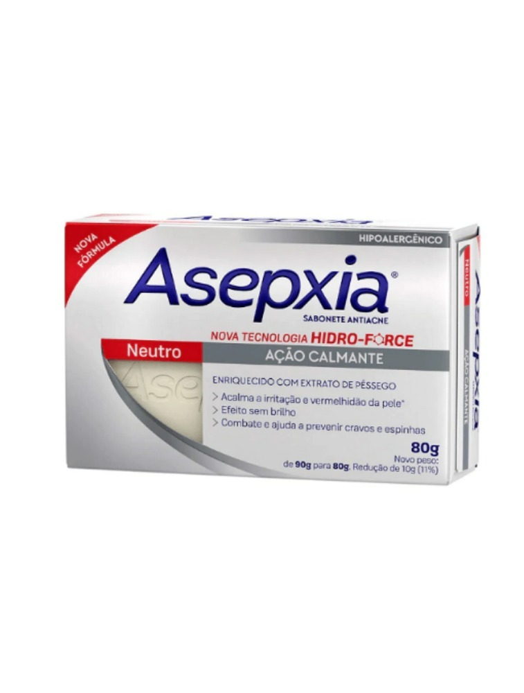Sabonete em Barra Asepxia Antiacne Neutro acalma a vermelhidão e irritação da pele, reduz o excesso de brilho e combate à proliferação da bactéria causadora da acne. Com ele, seu rosto fica sequinho, limpo e com sensação de frescor.