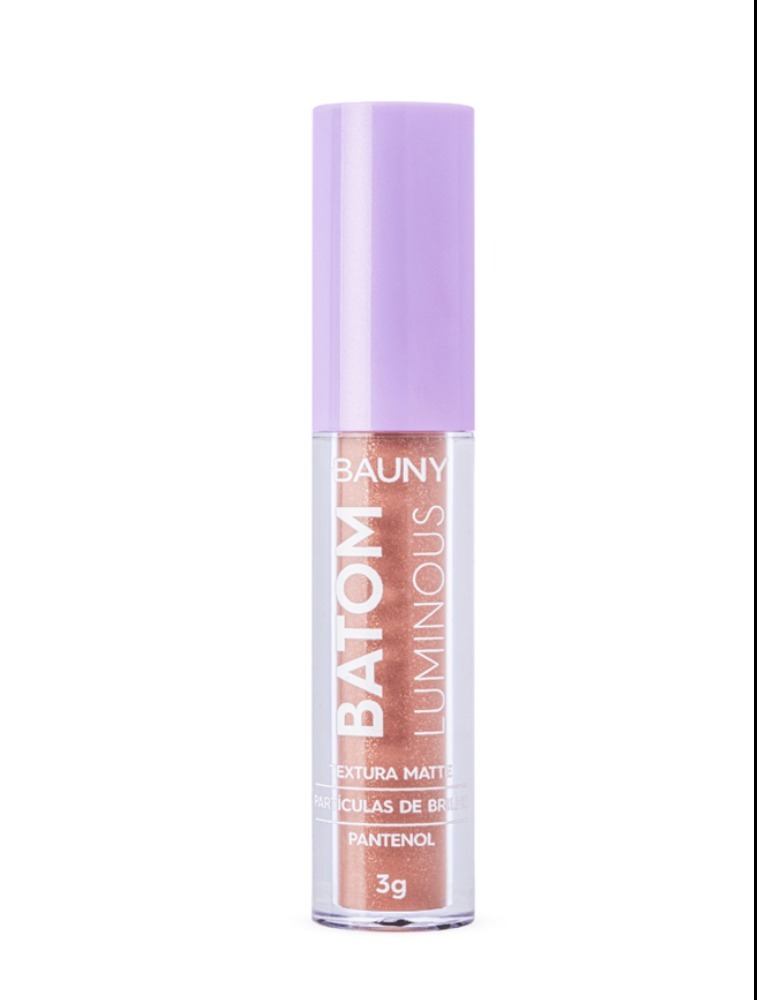 O batom líquido Luminous by Bauny é um batom líquido matte com brilho, que é ativado e potencializado após a secagem completa e fricção dos lábios.