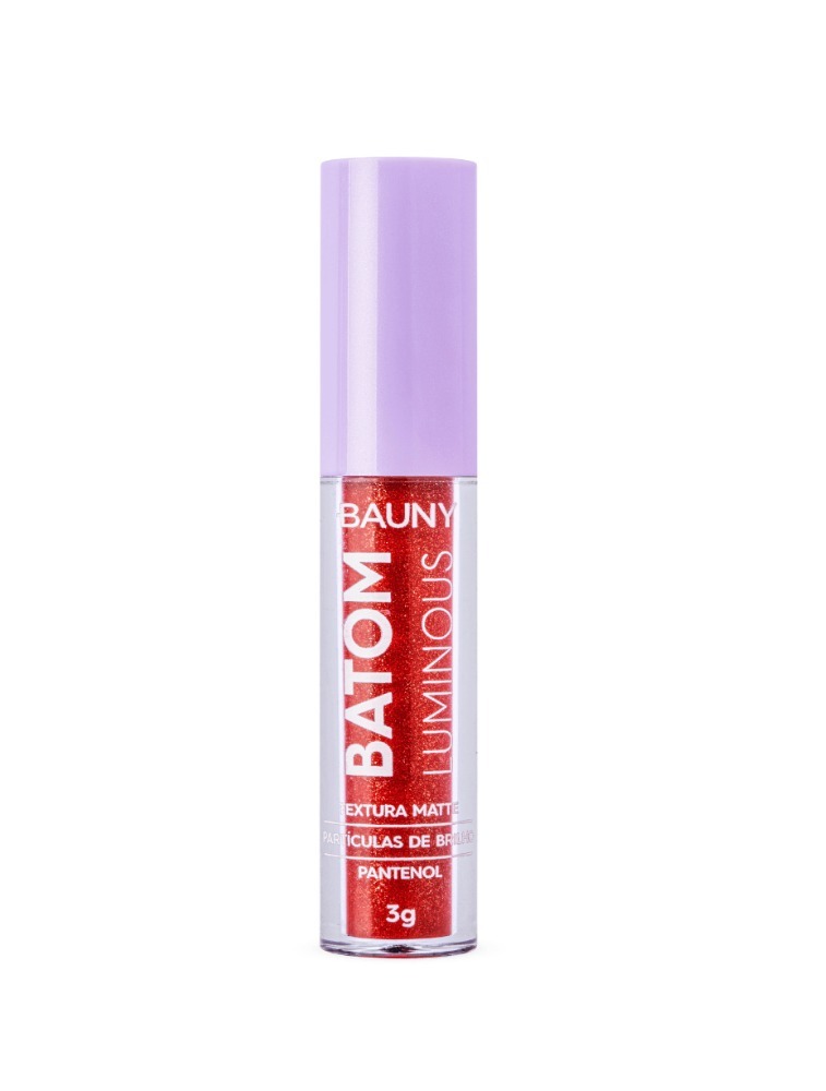 O batom líquido Luminous by Bauny é um batom líquido matte com brilho, que é ativado e potencializado após a secagem completa e fricção dos lábios.