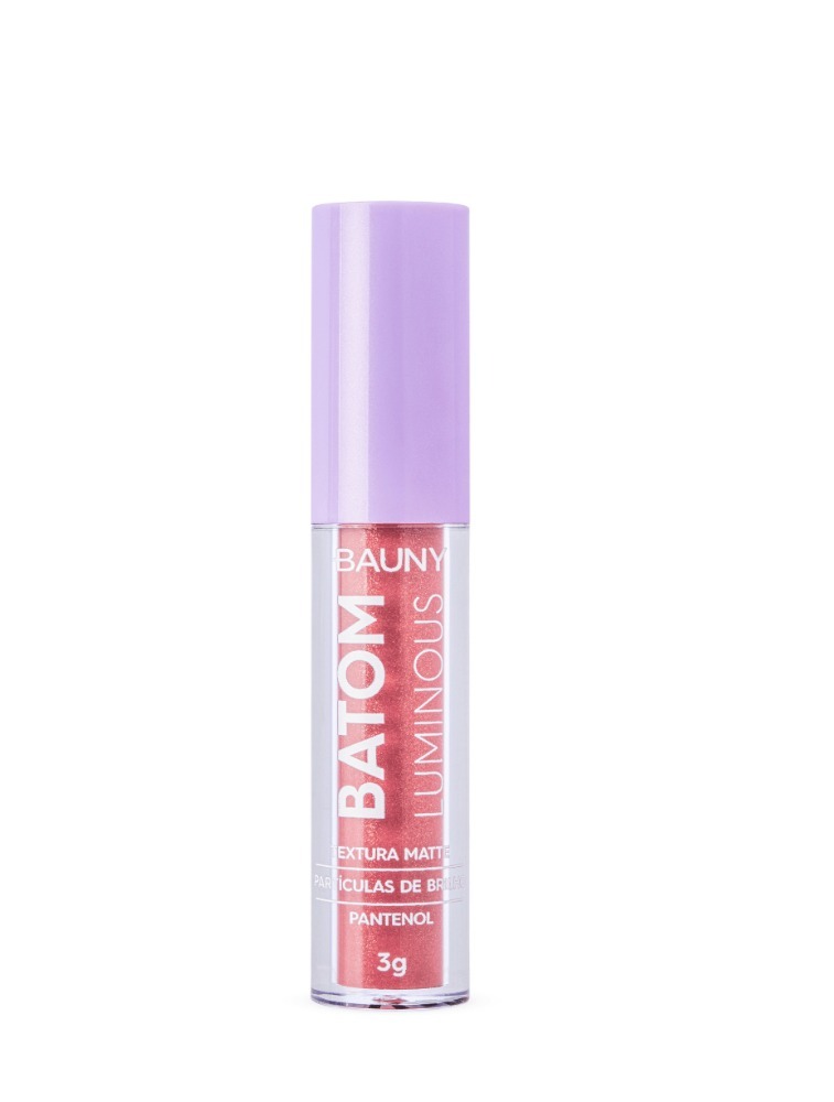 O batom líquido Luminous by Bauny é um batom líquido matte com brilho, que é ativado e potencializado após a secagem completa e fricção dos lábios.