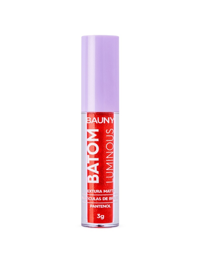 O batom líquido Luminous by Bauny é um batom líquido matte com brilho, que é ativado e potencializado após a secagem completa e fricção dos lábios.