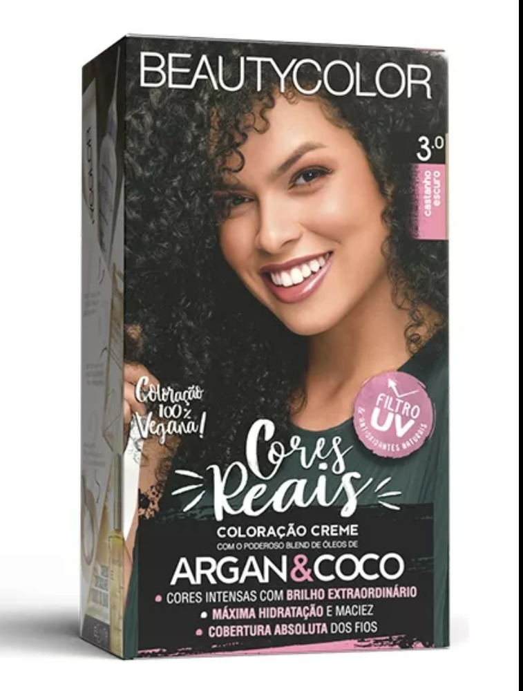 Coloração Permanente Kit Cores Reais - 3.0 Castanho Escuro A BEAUTYCOLOR é autoridade em inovação no desenvolvimento de colorações de alta performance com tecnologia profissional. Coloração 100% Vegana Com o poderoso Blend de óleos, Argan e Coco ESTE KIT CONTÉM: 1 Coloração Creme 45g 1 Emulsão Reveladora 67,5ml 1 Máscara de Hidratação Máxima 15ml 1 Sérum Intensificador de Brilho Antitérmico 2ml 1 Par de Luvas 1 Folheto Explicativo Modo de uso: Coloque a luva. Despeje aos poucos o conteúdo da bisnaga da Coloração Creme BEAUTYCOLOR dentro do frasco aplicador da Emulsão Reveladora e agite alternadamente até obter uma mistura cremosa e homogênea. Corte a ponta do frasco aplicador e inicie a aplicação. Proteja os ombros com uma toalha e a pele com um gel ou creme hidratante; Divida os cabelos em mechas; Prepare a mistura; Comece a aplicação, mecha por mecha, pela raiz. Utilize o bico aplicador para facilitar a aplicação; Nuances até 10.0, deixe agir por 15 minutos. Nuances acima de 10.11, deixe agir por 20 minutos. Obs: Não utilize touca nem prenda o cabelo durante o tempo de ação do produto Distribua o restante do produto para o comprimento e pontas, massageando os cabelos para que o produto se espalhe de maneira uniforme; Nuances até 10.0, deixe agir por 15 minutos. Nuances acima de 10.11, deixe agir por 20 minutos. Terminado o tempo de ação, enxágue bem até que a água saia limpa; Aplique a Máscara de Hidratação Máxima BEAUTYCOLOR, massageie e deixe agir por alguns minutos. Enxágue; Aplique o Sérum Intensificador de Brilho Antitérmico BEAUTYCOLOR, seguindo as instruções abaixo: Importante: a mistura obtida deverá ser aplicada imediatamente. Deixar a mistura parada por muito tempo antes da aplicação poderá aquecer o frasco aplicador e reduzir a ação do produto.