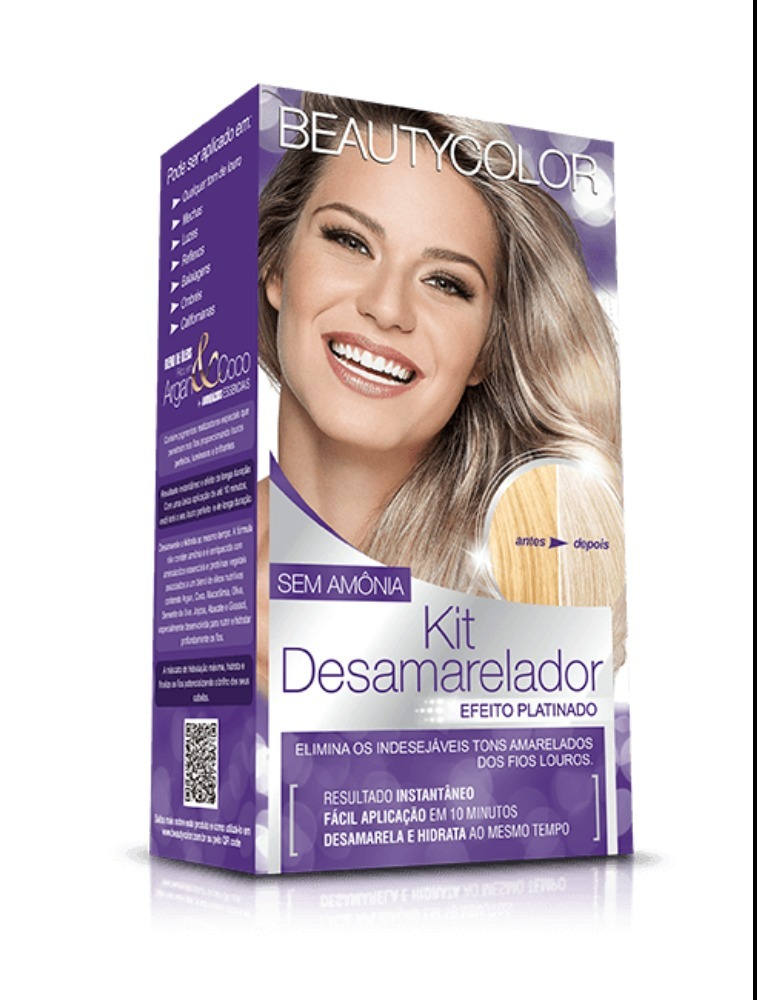 Com o Kit desamarelador, você matiza seu cabelo em 10 minutos. Sua fórmula contém pigmentos especiais que penetram nos fios, deixando o platinado perfeito e muito brilhante.