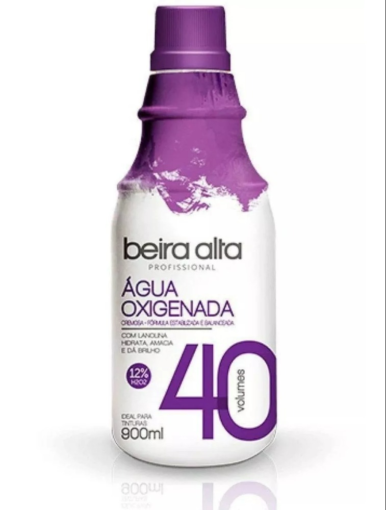 Água Oxigenada Cremosa 40Volumes Beira Alta. É usada para tinturas de tons claríssimos. Clareia até 5 tons. Contém Lanolina, emoliente especial para processos químicos, que hidrata, fornece brilho, evitando o ressecamento dos cabelos. Prova de Toque: