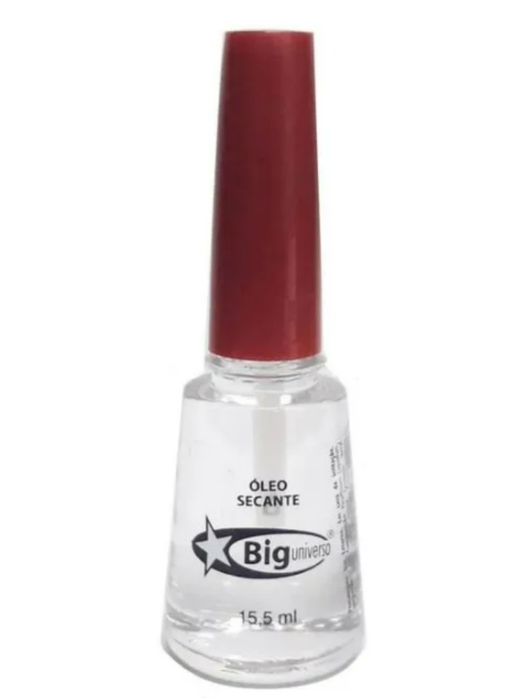 Saiba mais sobre o produto: Esmalte Big Universo Óleo Secante 15,5ml O Óleo Secante foi desenvolvido para proteger as suas unhas durante a secagem do esmalte. O uso do Óleo Secante evita que partículas grudem em seu esmalte e comprometam o seu acabamento final. Modo de uso: Passe um pequena quantidade do óleo com o pincel e aplique bem no centro da unha e nos cantos