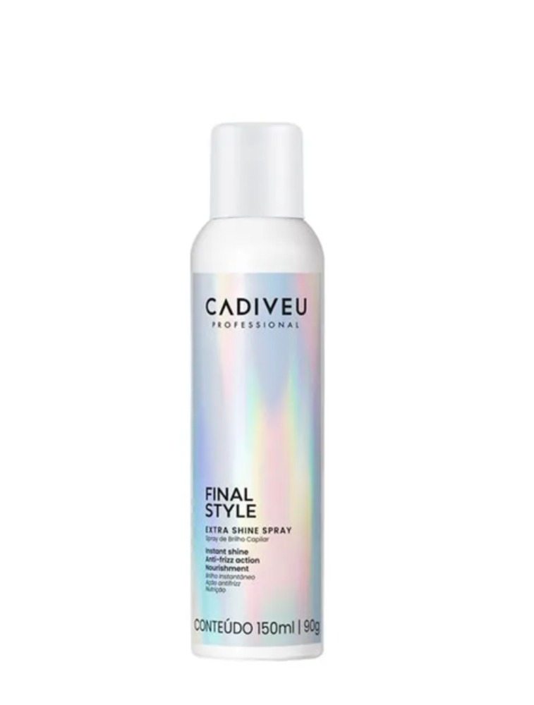 O Spray de Brilho Cadiveu Professional Final Style com 150 ml, é um Spray profissional de alta performance, tem ação instantânea que proporciona um brilho incrível para um resultado de luminosidade natural nos fios. Proporciona um efeito que realça e valoriza os penteados com ação duradoura, sem tirar o movimento.