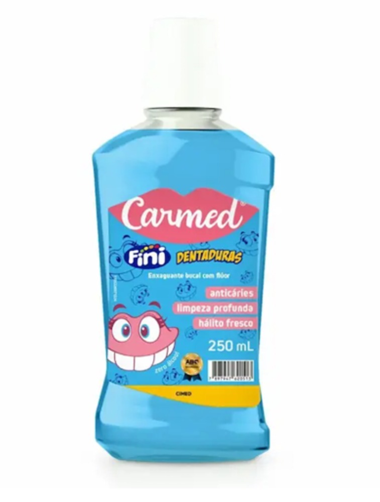 O Enxaguante Bucal Carmed Fini com sabor da bala Fini Dentaduras possui flúor e ação anticárie, além de realizar uma limpeza profunda e hálito fresco. Sua fórmula é zero álcool e não testada em animais.