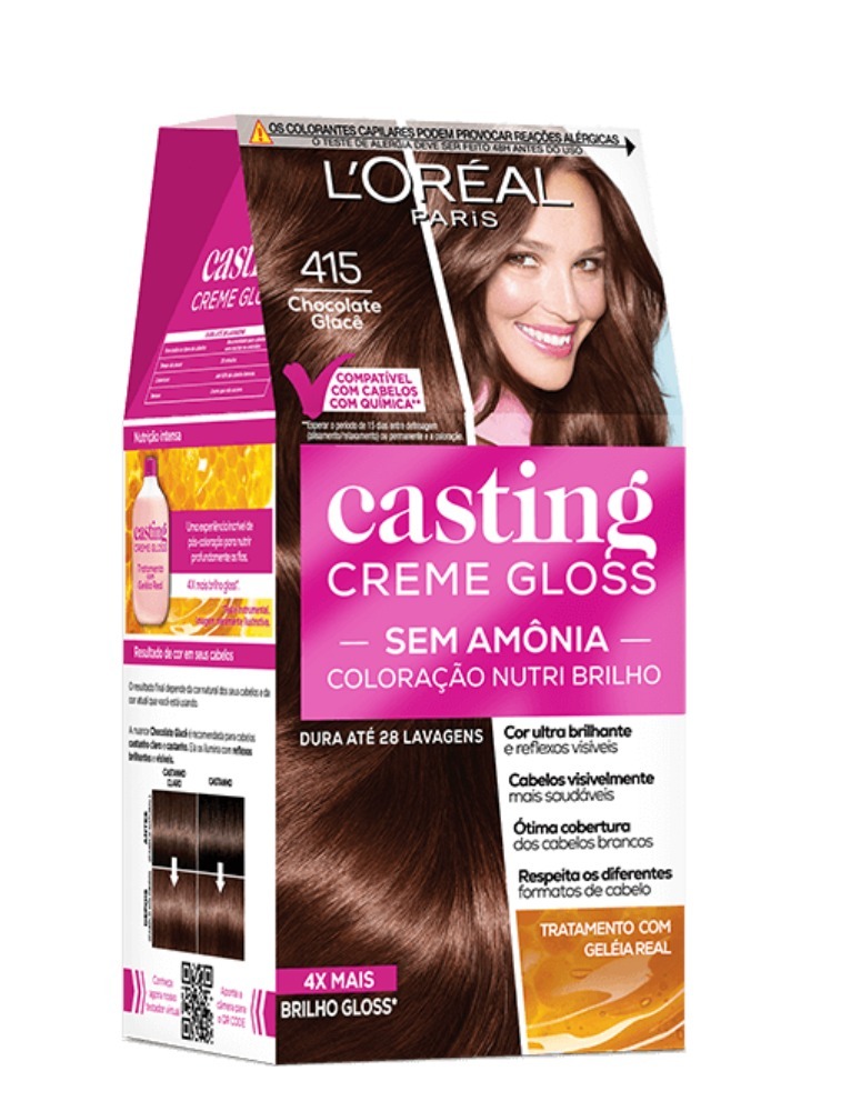 • A coloração sem amônia Casting Creme Gloss ainda reforça a fibra capilar, deixa os cabelos mais macios e proporciona um toque aveludado para os fios.