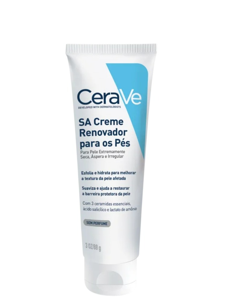Creme renovador para os pés. CeraVe SA promove uma pele mais hidratada, suave e macia, além de proteger e restaurar a textura do ressecamento, rachadura e aspereza.
