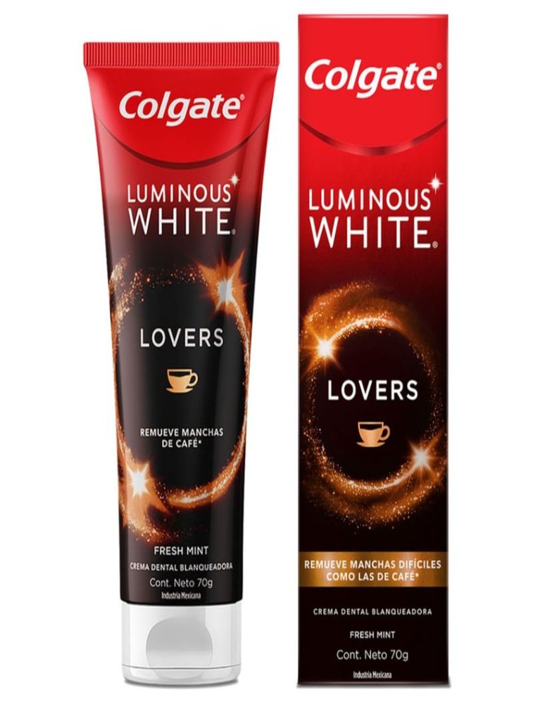 O creme dental clareador Colgate Luminous White Lovers Manchas de Café tem uma tecnologia para clareamento dental avançado desenvolvido para remover manchas profundas nos dentes causadas pelo café, proporcionando um sorriso mais branco e brilhante sem precisar abrir mão dos prazeres do dia a dia.
