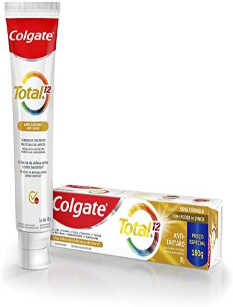Colgate ® Total 12 Anti-tártaro. Fórmula avançada com a tecnologia Zinco em dobro + Arginina, combate as bactérias em 100% das superfícies da boca. Com microparticulas limpadoras que evita que o acúmulo de placa bacteriana vire tártaro. *Reduz as bácterias em toda as áreas da boca.