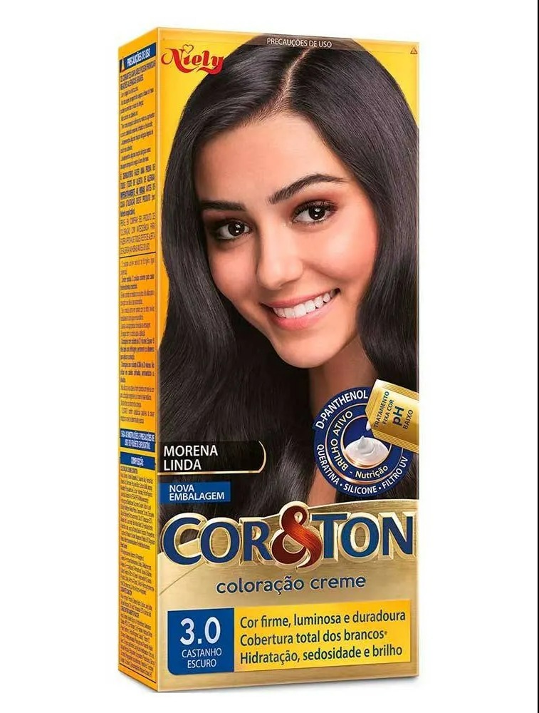 Saiba mais sobre o produto: Coloração Cor&Ton Mini Kit 3.0 Castanho Escuro 180g A Tintura Creme Cor & Ton é uma coloração permanente com fórmula de altíssima qualidade. Com Cor&Ton você realiza seu desejo de clarear ou escurecer os cabelos, realçar sua cor natural, revelar reflexos ou cobrir os cabelos brancos. Experimente! Modo de uso: Coloque a tinta no frasco aplicador e agite bem até ficar homogêneo. Separe o cabelo e aplique da raiz as pontas e espalhe uniformemente em todo o cabelo (aplique a tinta com o cabelo seco). Retire o produto após 35 ou 40 minutos da aplicação. Para cabelo curto usar somente 1 Caixinha, para cabelo longo utilizar 2 caixinhas. Seguir orientação na caixinha.