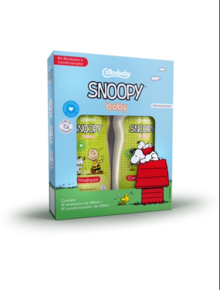 O novo Kit Shampoo e Condicionador Cottonbaby Snoopy Gotas de Camomila foi elaborado especialmente para a limpeza e hidratação dos cabelos delicados das crianças, pois possuem ingredientes de origem natural, deixando os cabelos do bebê mais macios e com o agradável cheirinho de banho tomado por mais tempo. Sua fórmula é suave, sem a presença de parabenos. E com Snoopy o banho será ainda mais divertido, e o melhor: sem lágrimas!