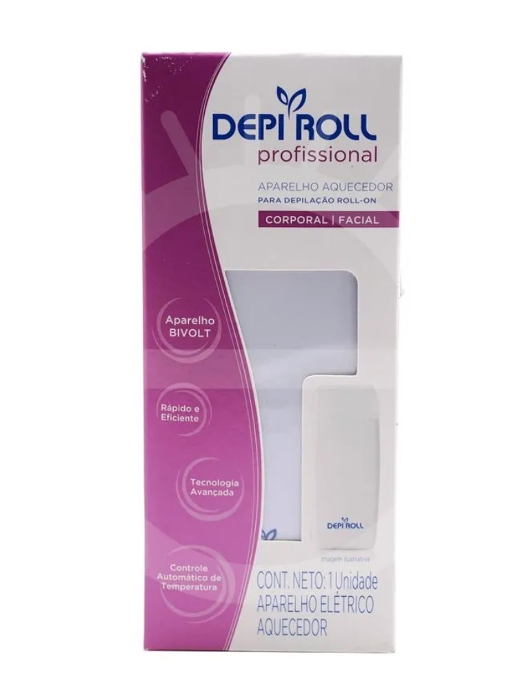 DepiRoll Aparelho Aquecedor para Depilação Roll On: Características: Possui um termostato interno que liga e desliga automaticamente, mantendo a temperatura da cera constante, para uma depilação segura. Aparelho para depilação com refil roll on corporal e/ou facial Benefícios: Pode ficar ligado 24 horas, sem superaquecimento. Temperatura de aquecimento regulada para uso com refil roll on, Rápido e eficiente, Tecnologia avançada, Controle automático da temperatura, Bivolt, Siga as instruções de uso: Antes da depilação, a pele deverá estar completamente limpa, seca, sem suor nem resíduos de cremes. Não utilize o produto mais de duas vezes no mesmo local durante a depilação. Se restar algum pelo, remova-o com uma pinça. O produto não deve ser aplicado sobre mucosas ou em regiões próximas a elas, sobre ferimentos na pele, inflamações e irritações. Imediatamente antes ou após sua aplicação, não use produtos que contenham álcool (desodorante ou perfume), pois poderão ocorrer irritações. Precauções: Não utilize em crianças. Não aplicar o produto na mesma região em um prazo menor que 15 dias, pois esse é o tempo necessário para o crescimento dos pelos. Não use com a finalidade de barbear (rosto ou cabeça). Não recomendável para gestantes. Caso a região depilada apresente vermelhidão, evite exposição ao sol. Este produto é próprio para o uso a que se destina; entretanto, poderão ocorrer sensibilizações na pele. Uso externo. Mantenha fora do alcance de crianças. Evite contato com os olhos.