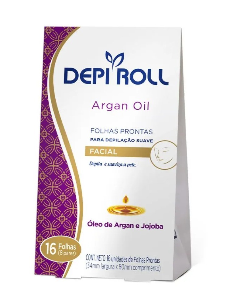 DepiRoll Folhas Prontas Facial Argan 8 Pares. Tripla ação: depila, hidrata e suaviza a pele. Fabricadas com tecnologia e qualidade: são práticas, econômicas e trazem um resultado rápido e eficaz. Deve ser utilizado para buço e sobrancelha. Depilam desde a raiz por até quatro semanas, deixando a pele suave ao toque. Siga as instruções de uso. Antes da depilação, a pele deverá estar completamente limpa, seca, sem suor nem resíduos de cremes. Não utilizar o produto mais de duas vezes no mesmo local durante a depilação. Se restar algum pelo, remova-o com uma pinça. O produto não deve ser aplicado sobre mucosas ou em regiões próximas a elas, sobre ferimentos na pele, inflamações e irritações. Imediatamente antes ou após sua aplicação, não use produtos que contenham álcool (desodorante ou perfume), pois poderão ocorrer irritações. Não utilizar em crianças. Não aplicar o produto na mesma região em um prazo menor que 15 dias, pois esse é o tempo necessário para o crescimento dos pelos. Não use com a finalidade de barbear (rosto ou cabeça). Não recomendável para gestantes. Caso a região depilada apresente vermelhidão, evite exposição ao sol. Este produto é próprio para o uso a que se destina; entretanto, poderão ocorrer sensibilizações na pele. Antes de usar, teste em uma pequena área. Uso externo. Mantenha fora do alcance de crianças. Evite contato com os olhos. Importante: Não recomendamos depilar a parte inferior das sobrancelhas. A puxada deve ser realizada sempre rente à pele. Caso contrário, a cera poderá se soltar da folha e aderir totalmente à pele, impedindo a remoção do pelo. Caso isso ocorra, nunca tente remover a cera usando instrumentos afiados, solventes (álcool, acetona, etc.) Ou rebatendo a folha. Utilize apenas um pedaço de algodão embebido no removedor óleo pós depilatório depiroll, fazendo massagem em movimentos circulares sem friccionar excessivamente. Utilize quantos pedaços de algodão forem necessários. Se mesmo com a utilização correta ficar algum excesso, limpe com a própria folha, pressionando-a levemente sobre a pele. Retire os últimos resíduos da depilação com o Removedor Óleo Pós Depilatório DepiRoll. Para terminar, use o Finalizador Gel Pós Depilatório DepiRoll. Modo de usar: Produto indicado para depilação de buço e sobrancelha. Faça a limpeza da área a ser depilada. Aqueça um par de Folhas Prontas para Depilação Facial Argan Oil entre as mãos por 30 segundos. Em temperatura ambiente “fria”, aqueça por mais tempo, até que o par de folhas se separe facilmente, deixando a cera uniforme dos dois lados. Separe as folhas lentamente. Dobre uma das folhas e reserve-a. Antes de utilizá-la, aqueça-a entre as mãos novamente. Depile um lado do buço de cada vez. Aplique uma Folha Pronta para Depilação Facial Argan Oil em uma metade do buço (sentido do meio dos lábios para a lateral). Pressione levemente com os dedos sem esfregar (aderindo bem). Estique a pele próxima à bochecha e remova rapidamente a folha no sentido contrário, puxando rente à pele. Proceda da mesma forma do outro lado. Depile uma sobrancelha de cada vez. Aplique uma Folha Pronta para Depilação Facial Argan Oil paralelamente à parte superior da sobrancelha (sentido do centro do rosto para a lateral). Pressione levemente com os dedos sem esfregar (aderindo bem). Estique a pele e remova rapidamente a folha no sentido contrário, puxando rente à pele. Proceda da mesma forma do outro lado.