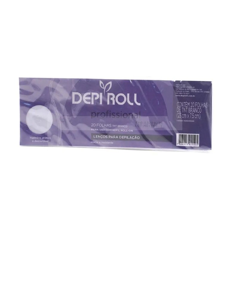 DepiRoll Lenços para Depilação Brancos: Lenços de fibra natural. Removem a cera com facilidade. Este produto deve ser utilizado juntamente com o Refil Roll On DepiRoll, para remoção das ceras nos processos de depilação. Não aplicável Instruções de uso: Este produto não deve ser aplicado sobre mucosas ou em regiões próximas a elas (seios, área perianal e genital), sobre ferimentos na pele, inflamações ou irritações (acne, queimadura de sol). Não usar se a pele estiver irritada ou lesionada. Em caso de contato acidental do produto com a pele, limpe-a imediatamente. Não use em áreas de onde se extraíram os pelos com pinça, até que eles cresçam novamente. Não recomendável para gestantes ou crianças. Até 24 horas após sua aplicação, não use produtos que contenham álcool (perfumes ou desodorantes), pois poderão ocorrer irritações. Não aplicar o produto na mesma região em um prazo menor que sete dias. Não use com a finalidade de barbear (rosto e cabeça). Não deixe o produto sobre a pele por tempo superior ao indicado no modo de uso. Caso a região depilada apresente vermelhidão, evite exposição ao sol. Este produto é próprio para o uso a que se destina; entretanto, poderão ocorrer sensibilizações na pele. Antes de usar, faça o teste inicial. Uso externo. Mantenha fora do alcance de crianças. Evite contato com os olhos. Em caso de contato com os olhos, lave imediatamente com água morna em abundância e consulte um médico. Pode causar cegueira. A utilização deste produto é desaconselhada para pessoas que já tenham desenvolvido uma intolerância a depilatórios químicos.
