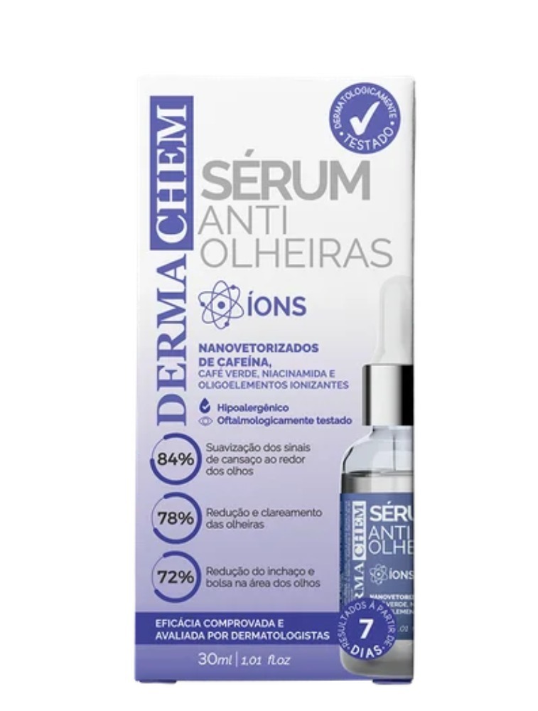 O Sérum Antiolheiras Dermachem Laboratory desenvolvido com a nanotecnologia da cafeína, café verde, base ionizada, ativos clareadores e revitalizantes como niacinamida e extrato de pepino que em conjunto tem ação efetiva melhorando a região dos olhos. Atuam intensamente na redução do inchaço, bolsas na área dos olhos e o contorno escuro das olheiras. Os ativos agem como um toque de mágica proporcionando alívio, bem estar e olhar renovado.