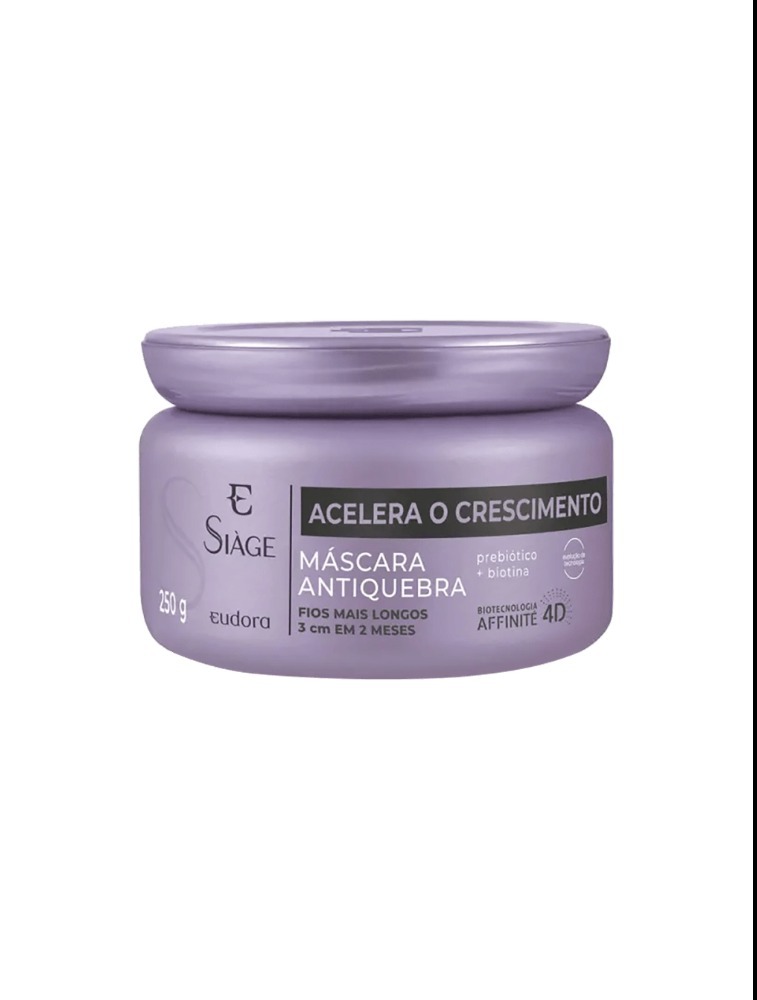 A Máscara Siàge Capilar Acelera o Crescimento tem ação antiquebra imediata, fios 6x mais resistentes e ultra hidratados. A fórmula de Siàge Acelera o Crescimento conta com Prebiótico e Biotina que atua diretamente no equilíbrio do couro cabeludo ativando o metabolismo do fio e estimulando o crescimento.