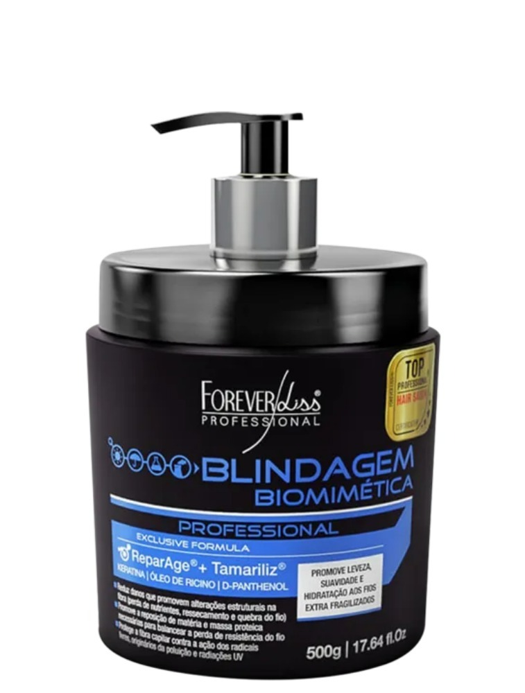 Máscara capilar para cabelos danificados. A Forever Liss Professional Blindagem Biomimética restaura a camada dos fios danificados pela química. Com uma fórmula, contendo complexo de aminoácidos, queratina, óleo de rícino e D-Pantenol, essa blindagem capilar possui ação antioxidante, prevenindo o envelhecimento dos fios.