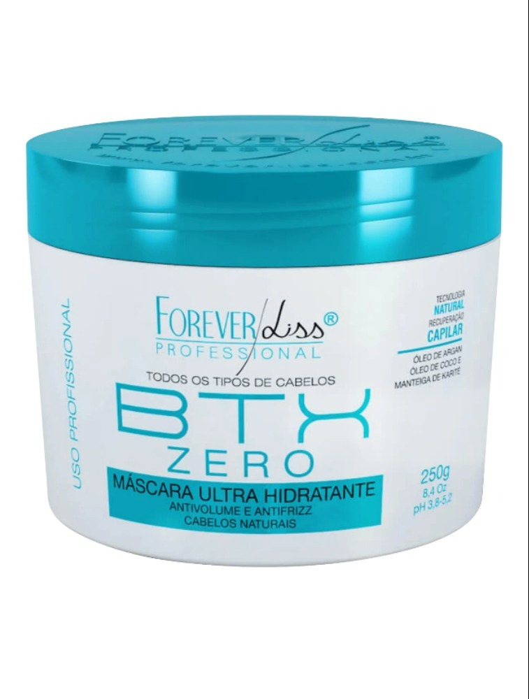 A Máscara Forever Liss Professional BTX Zero é enriquecida com Óleo de argan, Óleo de coco e Manteiga de Karité que possuem propriedades hidratantes e nutritivas, que o seu cabelo necessita para ser saudável. Além disso, reconstitui a estrutura dos fios e repõe a massa perdida. Não possui cheiro forte, não faz fumaça e não provoca ardência no couro cabeludo. Não testado em Animais.