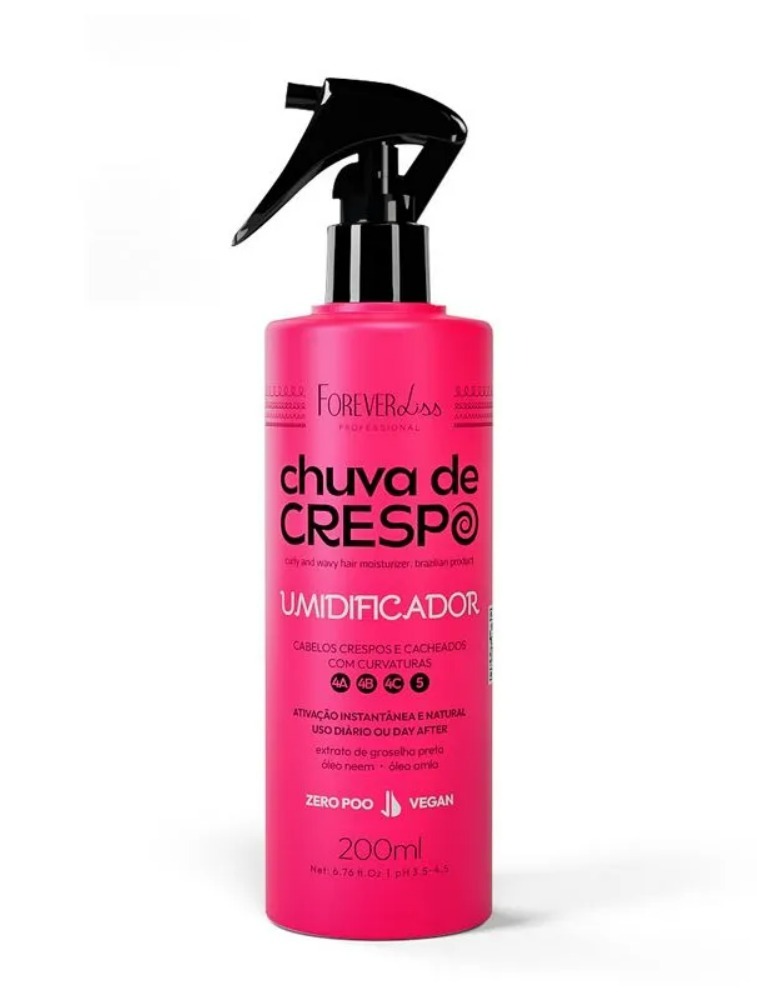 O Umidificador Chuva de Crespo Forever Liss traz uma inovação completa para o cuidado diário de crespos e crespíssimos, proporcionando proteção térmica, reparação de pontas, além de ativar as molas instantaneamente.