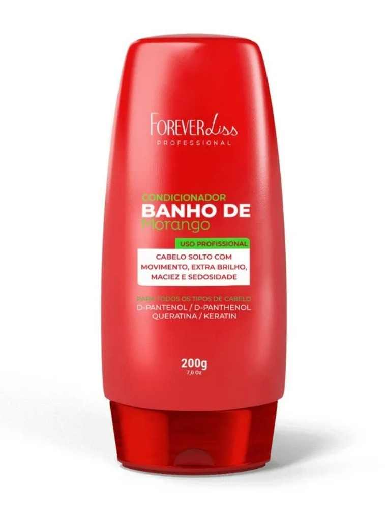 O Condicionador Banho de Verniz Morango Forever Liss age diretamente na fibra capilar hidratando profundamente, recuperando da porosidade e restaurando a saúde dos cabelos. Composto por Óleo de Coco, Extrato de Morango, Queratina e Pantenol, deixa os cabelos com movimento solto, maciez, sedosidade e extra brilho. Facilita o penteado e desembaraço dos fios, resultando em cabelos leves e muito mais resistentes. Além disso, contém proteção térmica e protege os fios contra os danos causados por fontes de calor como secador ou prancha.
