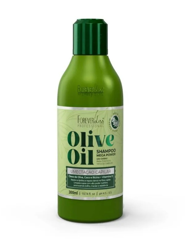 Shampoo Olive Oil Mega Power Forever Liss 300ml tratamento de Umectação capilar, sua fórmula é enriquecida com a potente combinação de óleo de oliva, óleo de coco, óleo de rícino e Vitamina D.